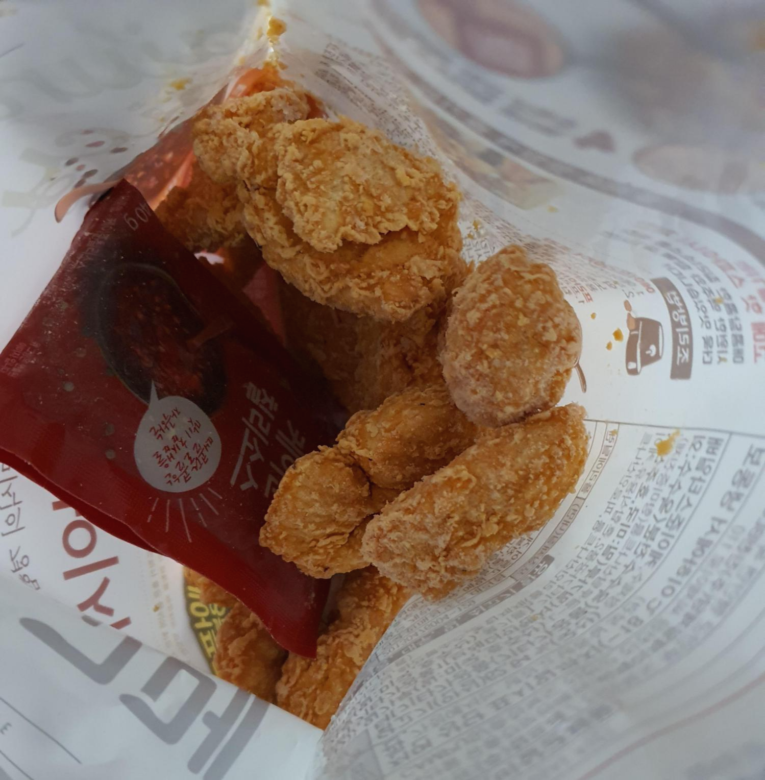 조금 더 날렵한 너겟 형태에 가까운 치킨 조각들이 들어 있었으며 은은한 빨강색을 띄었다.