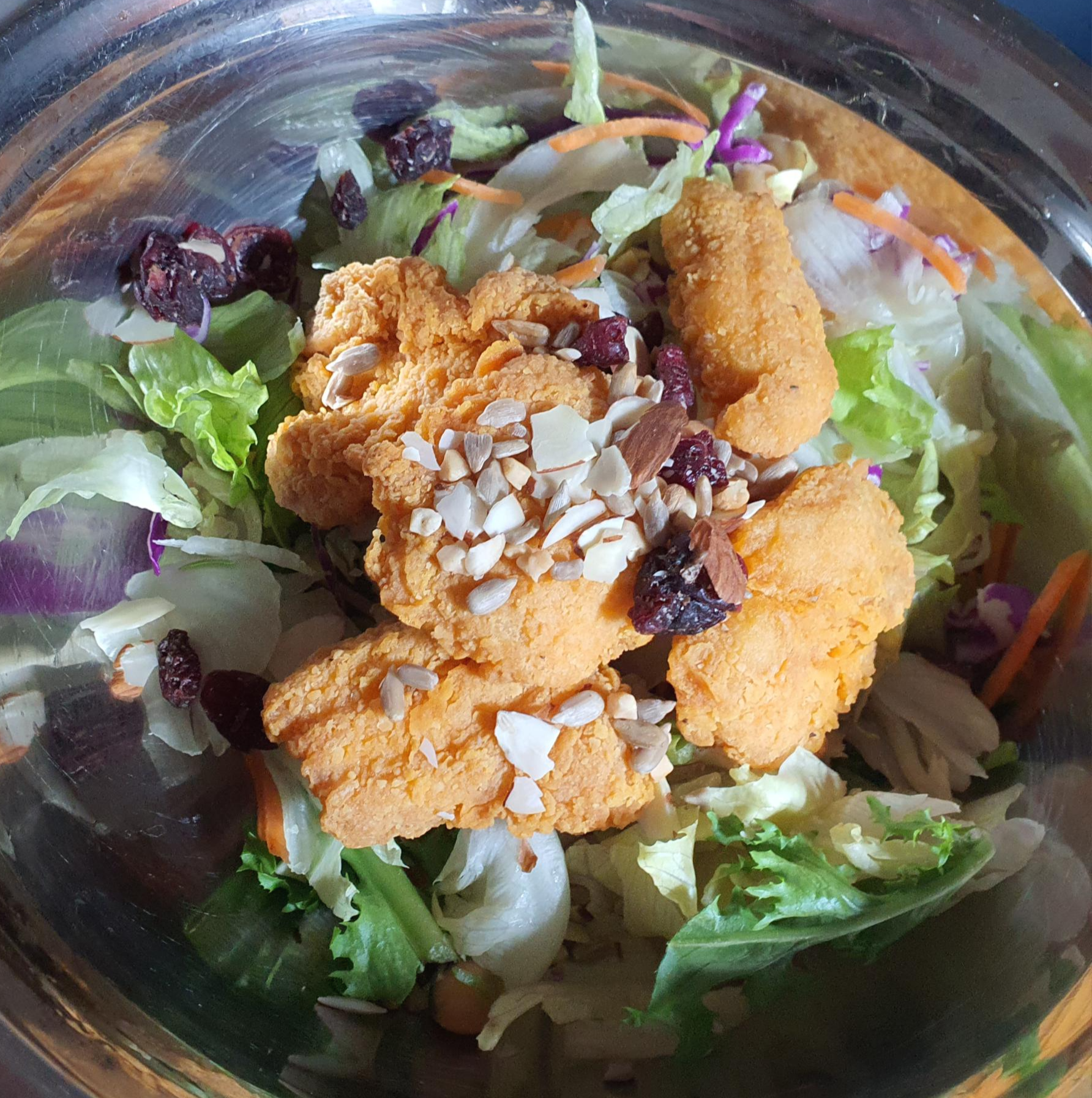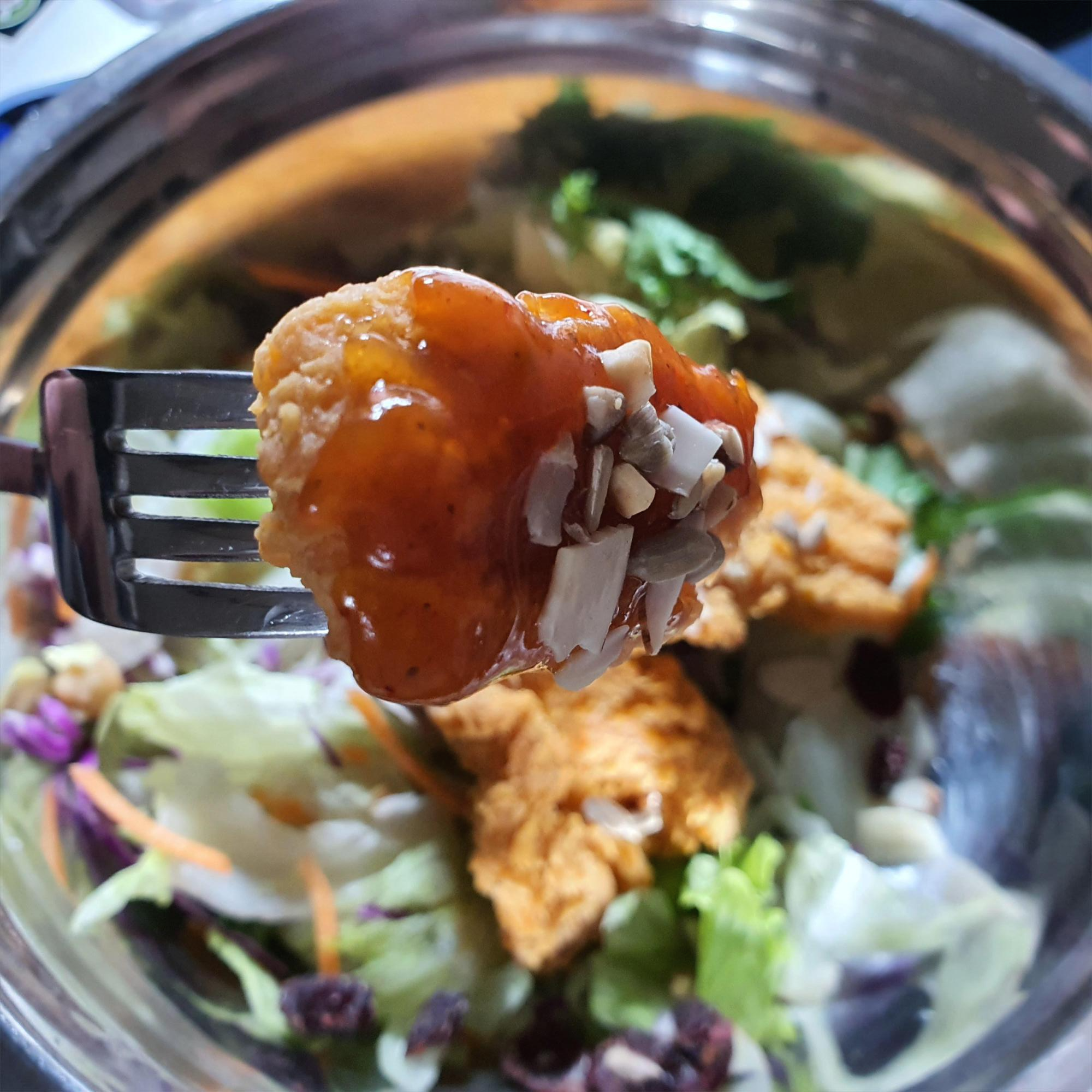 순살 치킨 + 칠리소스 + 견과류 토핑 + 샐러드